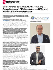 MUMBAI, MAHARASHTRA, INDIA, December 1, 2025 /EINPresswire.com/ — As global institutions in Banking, Financial Services & Insurance (BFSI) and Pharmaceuticals address with growing data volumes, operational bottlenecks, and mounting regulatory complexity, Contentverse by Computhink continues to lead the transformation of enterprise document management. With over 25 years of focused expertise, Computhink delivers purpose-built solutions that empower compliance-first organizations to gain control, ensure security, and drive digital efficiency across operations.